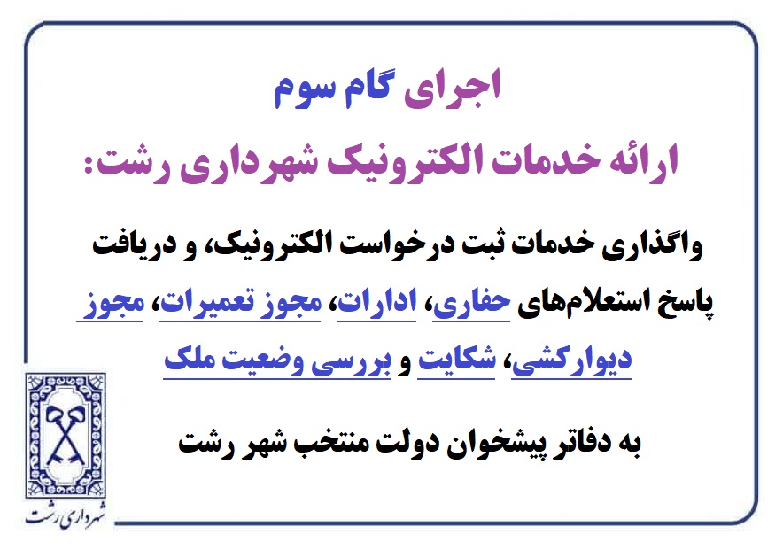 اینک در نظر دارد در گام سوم نسبت به واگذاری خدمات ثبت درخواست الکترونیک و دریافت پاسخ استعلامهای حفاری، ادارات، مجوز تعمیرات، مجوز دیوارکشی، شکایت و بررسی وضعیت ملک به دفاتر پیشخوان دولت شهر رشت اقدام نماید.